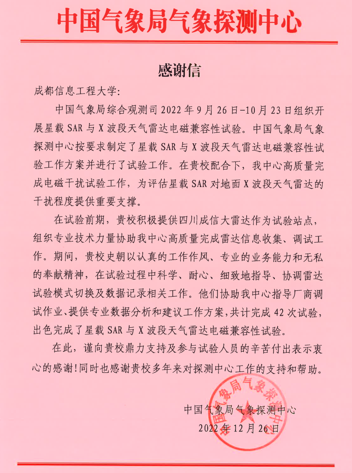 近日,我校收到中国气象局气象探测中心发来的一封感谢信,就我校电子工程学院副院长史朝协助工作、出色完成星载SAR与X波段天气雷达电磁兼容性试验表示感谢。感谢信详细内容如下: