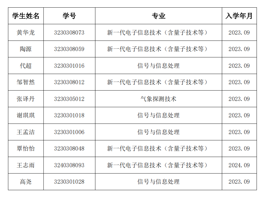 根据成都信息工程大学相关文件规定,本着公开、公平、公正的原则,电子工程学院2024-2025学年研究生国家奖学金评审经学生个人申请、班级推荐、学院评审,共推荐10名候选人,现将我院2024-2025学年研究生国家奖学金拟推荐学生名单予以公示。如有异议,请于2025年10月15日至2025年10月17日到新气象楼1211办公室反映。联系人:杨老师,电话:028-85966916、028-85966349邮箱:yangyong@cuit.edu.cn。